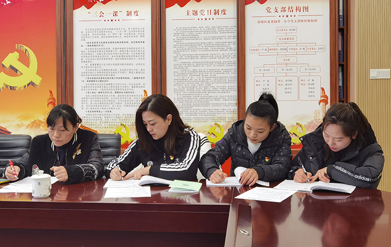 在贵州省贵阳市南明区花果园第一小学举行的主题党日活动上,教师们在做笔记(2020年12月2日摄)。新华社发(许颖 摄)