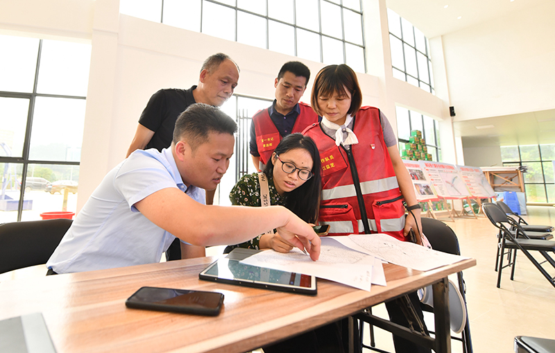2022年5月6日,广西柳州市融安县大坡乡岗伟村驻村第一书记黄晨晖(后排右)和乡镇干部、工程设计人员在大坡飞鸡农特产品大数据中心讨论岗伟村产业示范带方案。新华社记者 黄孝邦 摄