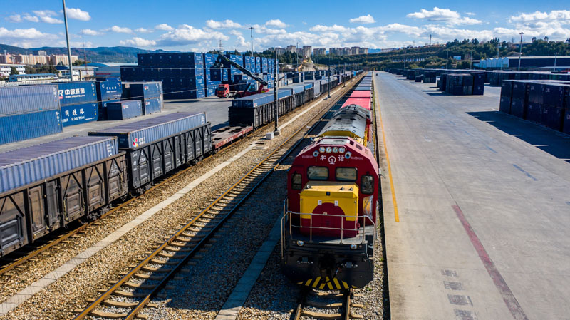 满载30个标准集装箱的中老铁路新年首趟国际货物列车停靠在中铁联集昆明中心站(2022年1月1日摄,无人机照片)。新华社记者 胡超 摄