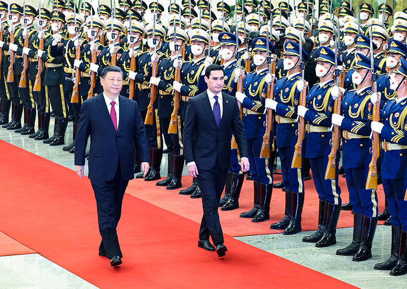 会谈前,习近平在人民大会堂北大厅为谢尔达尔·别尔德穆哈梅多夫举行欢迎仪式。