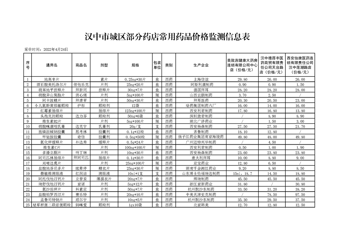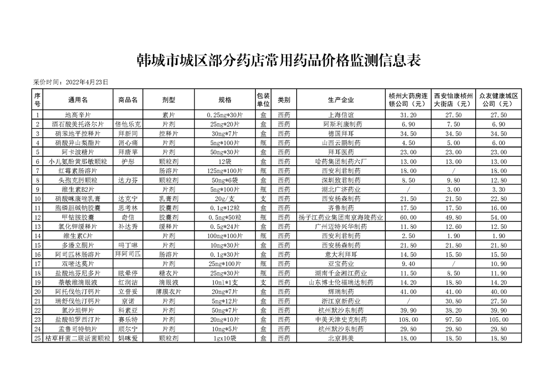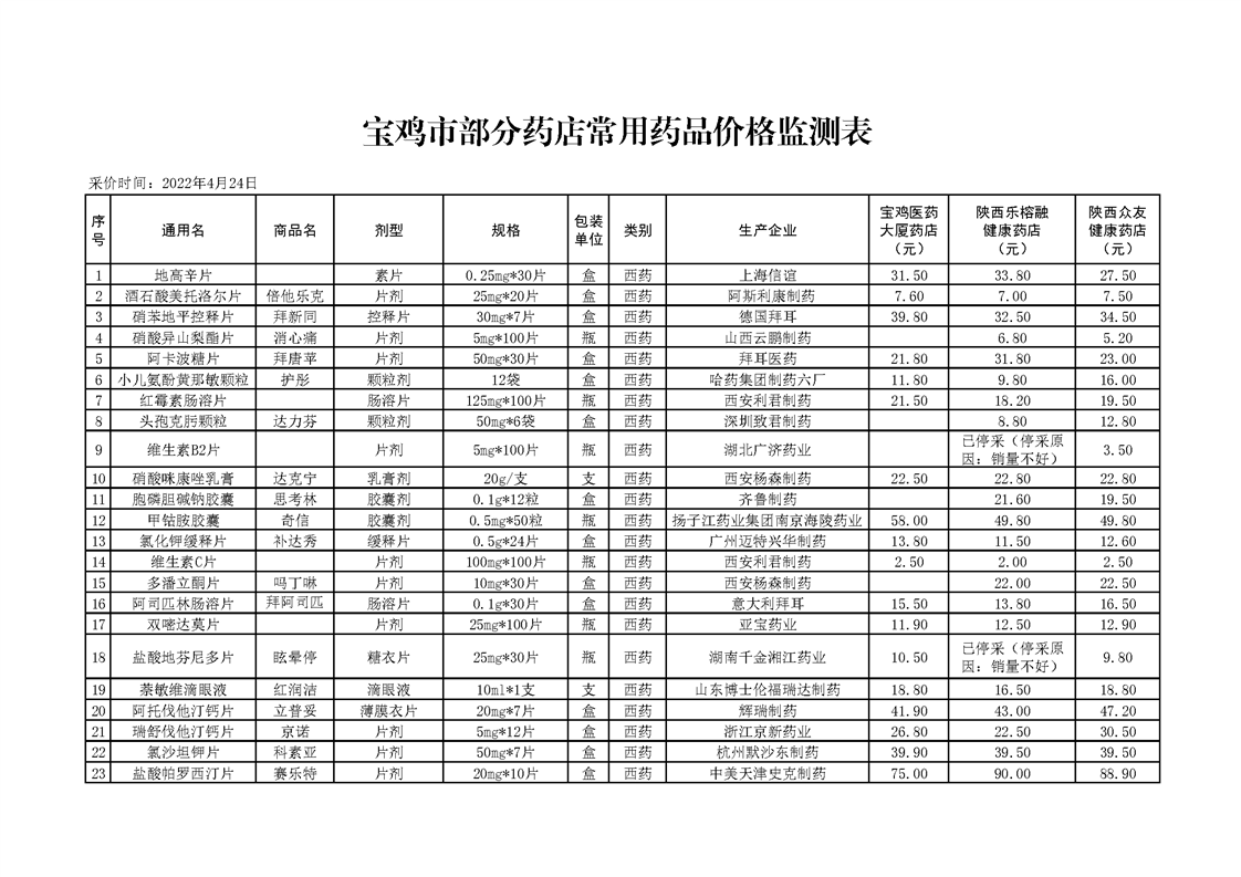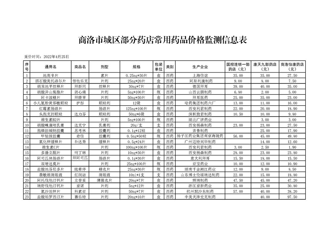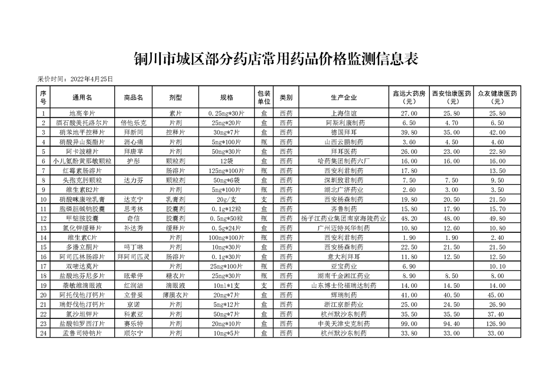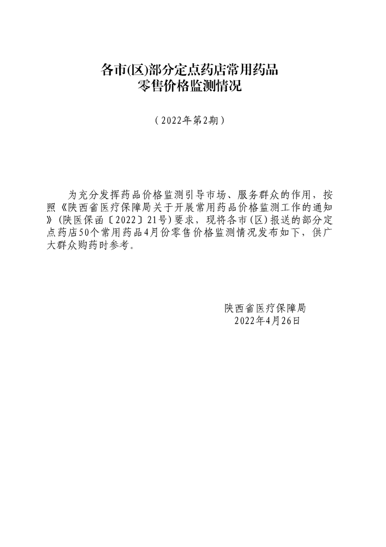 各市(区)部分定点药店常用药品零售价格监测情况(2022年第2期)