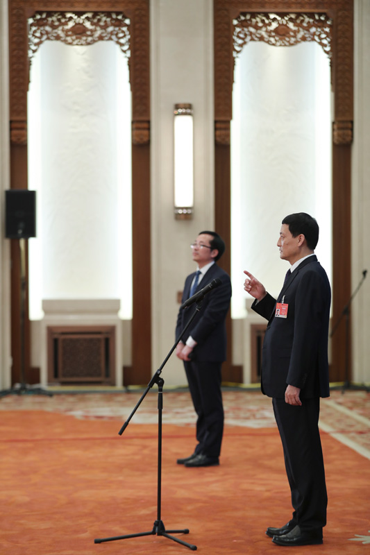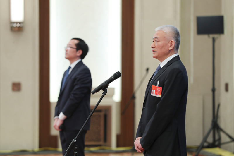 3月8日,第十三届全国人民代表大会第四次会议举行第二场“部长通道”采访活动。这是工业和信息化部部长肖亚庆(右)通过网络视频方式接受采访。