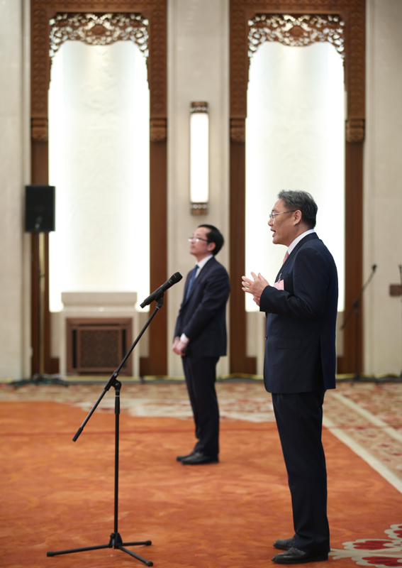 3月8日,第十三届全国人民代表大会第四次会议举行第二场“部长通道”采访活动。这是商务部部长王文涛(右)通过网络视频方式接受采访。