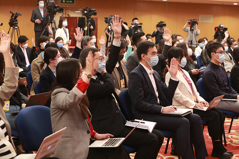 3月11日,国务院总理李克强在北京人民大会堂出席记者会并回答中外记者提问。这是记者在位于梅地亚中心的分会场举手提问。