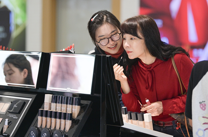 2024年2月20日,消费者在中免集团海口日月广场免税店选购离岛免税品。新华社记者 蒲晓旭 摄