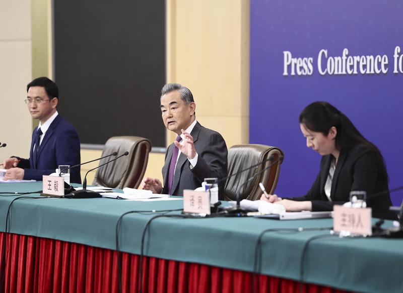 3月7日,十四届全国人大二次会议在北京梅地亚中心举行记者会。中共中央政治局委员、外交部长王毅就中国外交政策和对外关系回答中外记者提问。新华社记者 才扬 摄
