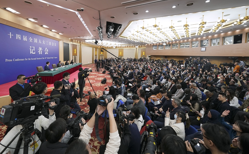3月7日,十四届全国人大二次会议在北京梅地亚中心举行记者会。中共中央政治局委员、外交部长王毅就中国外交政策和对外关系回答中外记者提问。这是记者在现场采访。新华社记者 刘续 摄