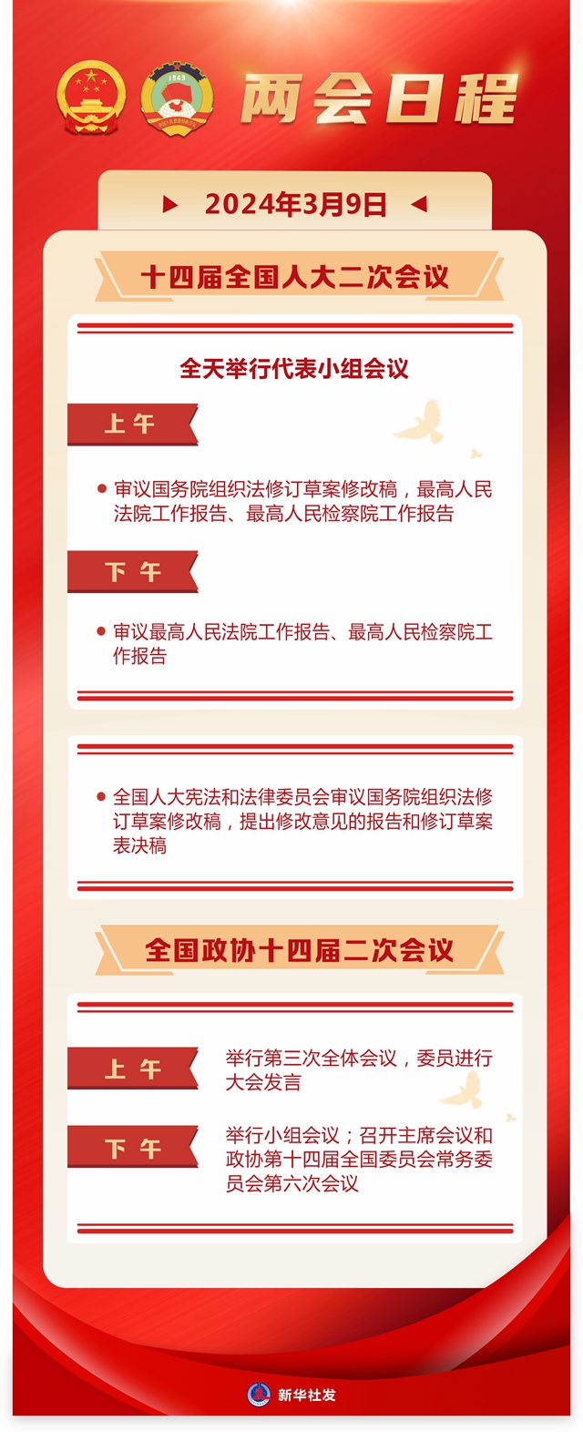 新华社北京3月8日电 十四届全国人大二次会议9日全天举行代表小组会议。上午,审议国务院组织法修订草案修改稿,最高人民法院工作报告、最高人民检察院工作报告;下午,审议最高人民法院工作报告、最高人民检察院工作报告。