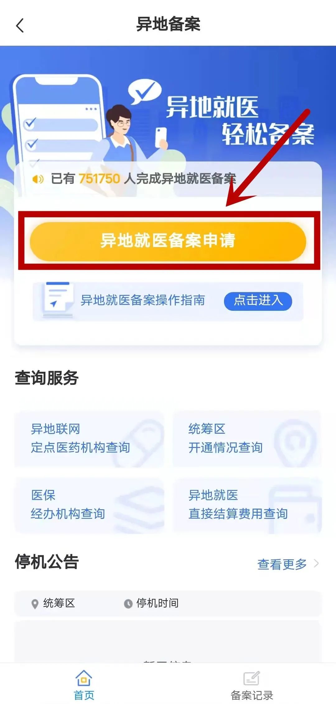 申请跨省异地就医备案后,可在“异地备案”页面下方找到备案记录,点击即可查询备案结果及详情。