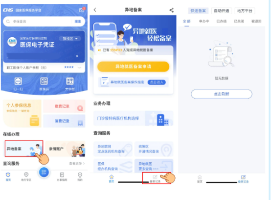 以国家医保服务平台APP为例,在【在线办理】模块,点击【异地备案】,点击【异地就医备案申请】根据提示即可完成备案。